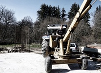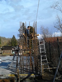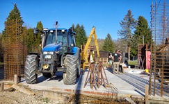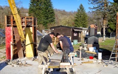 Die geschenkten Leimbinder, das Haupttragelement, werden abgebunden und mit Gerberstoß verbunden. Mit Kran, Marke Eigenbau, werden die Leimbinder auf die Betonecken gelegt und befestigt.