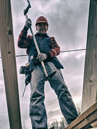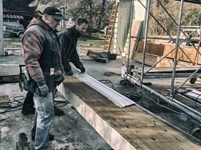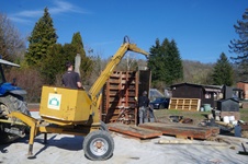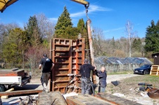 Die geschenkten Leimbinder, das Haupttragelement, werden abgebunden und mit Gerberstoß verbunden. Mit Kran, Marke Eigenbau, werden die Leimbinder auf die Betonecken gelegt und befestigt.