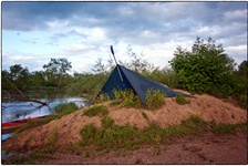 Auf einem hübschen Wiesenufer schlugen wir wohlgemut unser Nachtlager auf. Direkt beim nahen Brennholz, einem morschen Baum mit herumliegenden Ästen, hielten wir bis spätnachts ein schönes Lagerfeuer mit allem, was dazugehört.